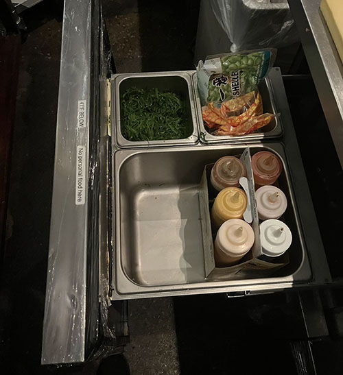 负责厨房菜箱寿司架子卫生,清洗所有酱料盖子